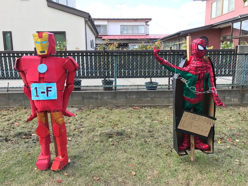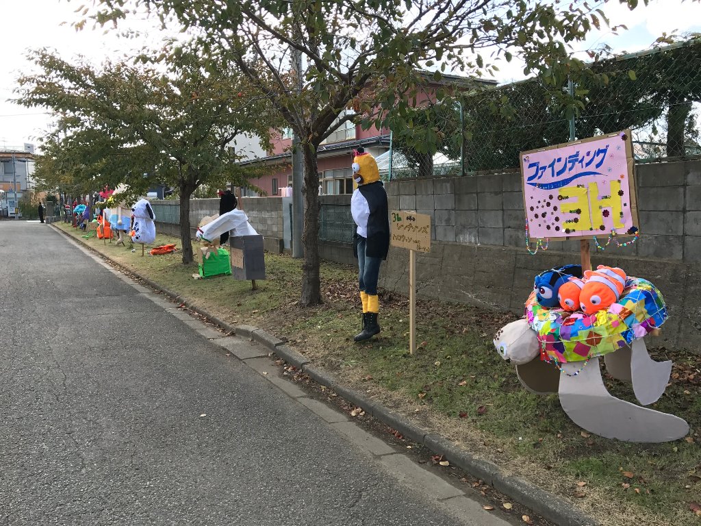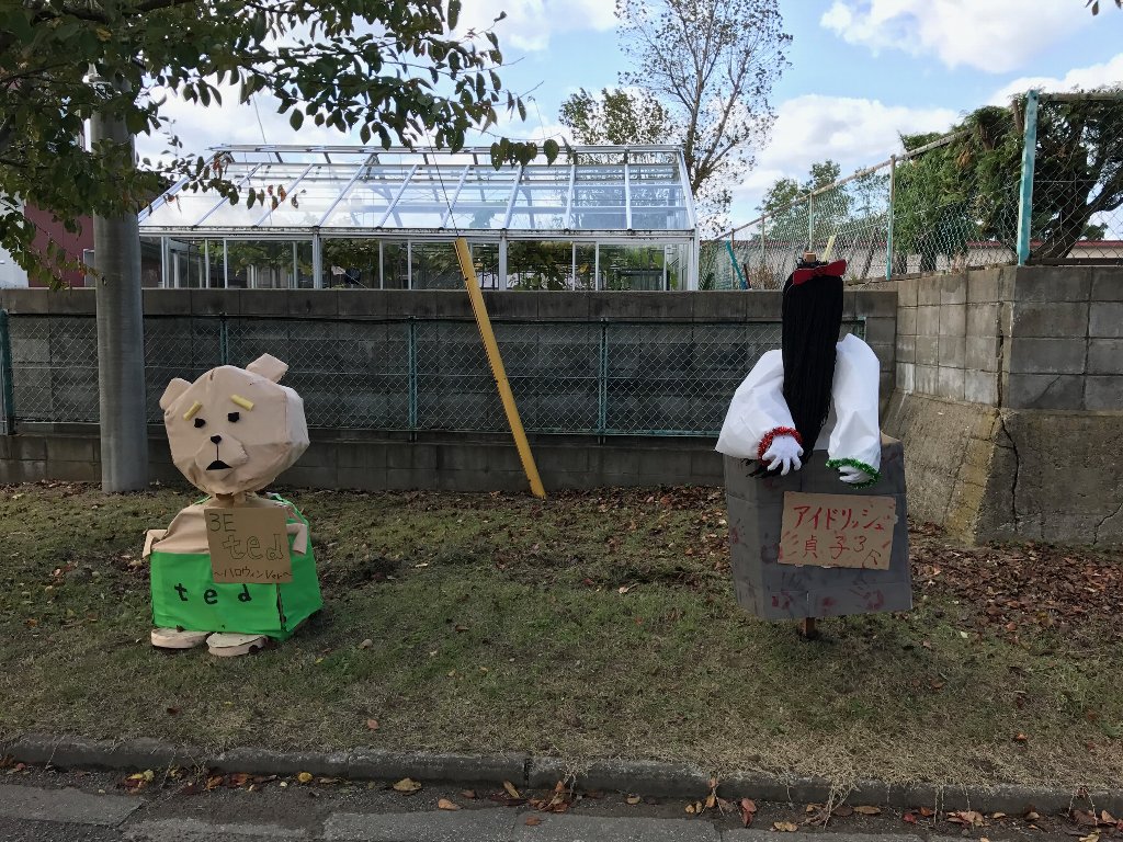 学校の敷地内に入って行く通路には農業高校らしくオリジナルの案山子の展示がありました。