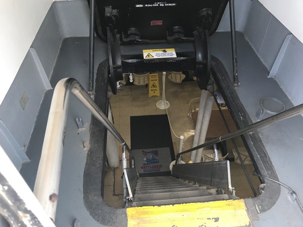 日本語ガイドさんの説明を受け、最後に「中にはそこから入れますから、ご自由にどうぞ!」 と言われフリータイムになります(^ ^; せっかくなので艦内も見ていくことに。 ドアを開けると、艦内に入る階段が。