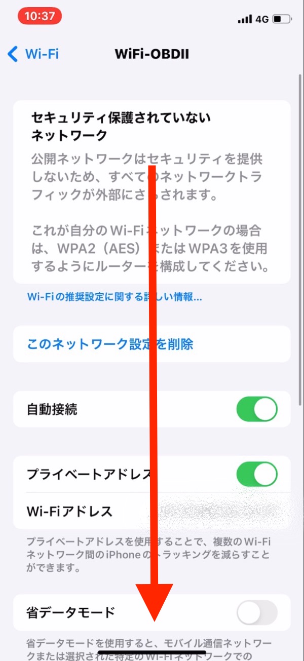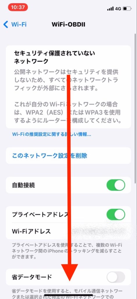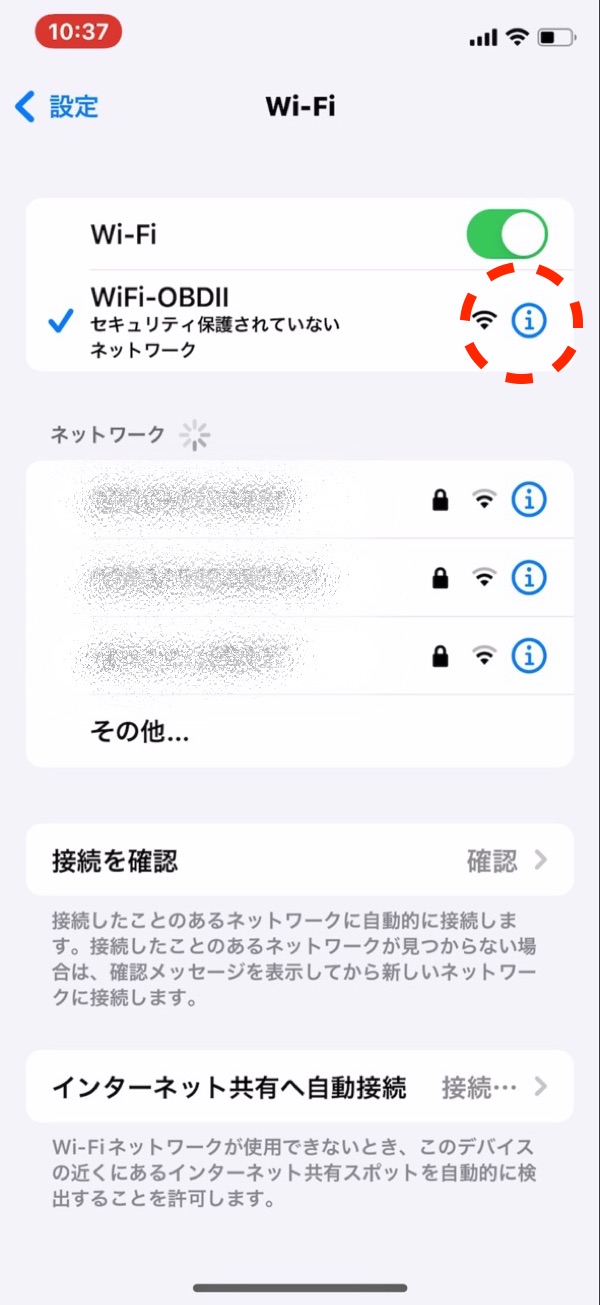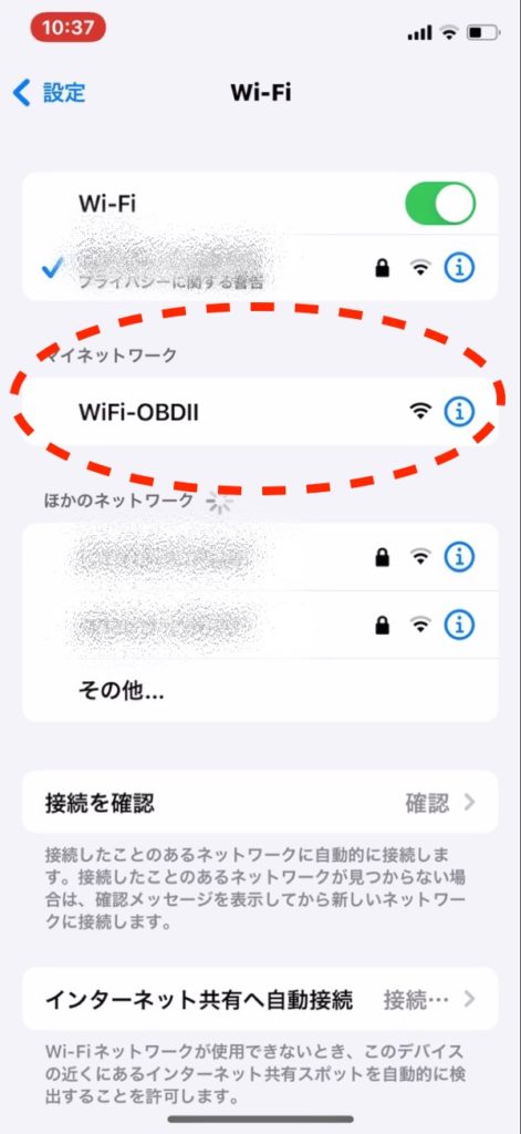 スマートフォンのWiFi設定画面を表示すると「OBD2」といったWiFiを検出するので、