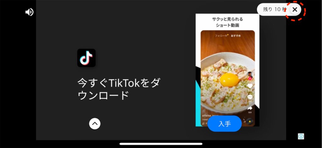 ・10数秒の広告が流れます。広告終了度、右上の×をタップします。