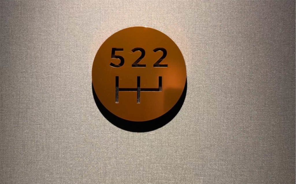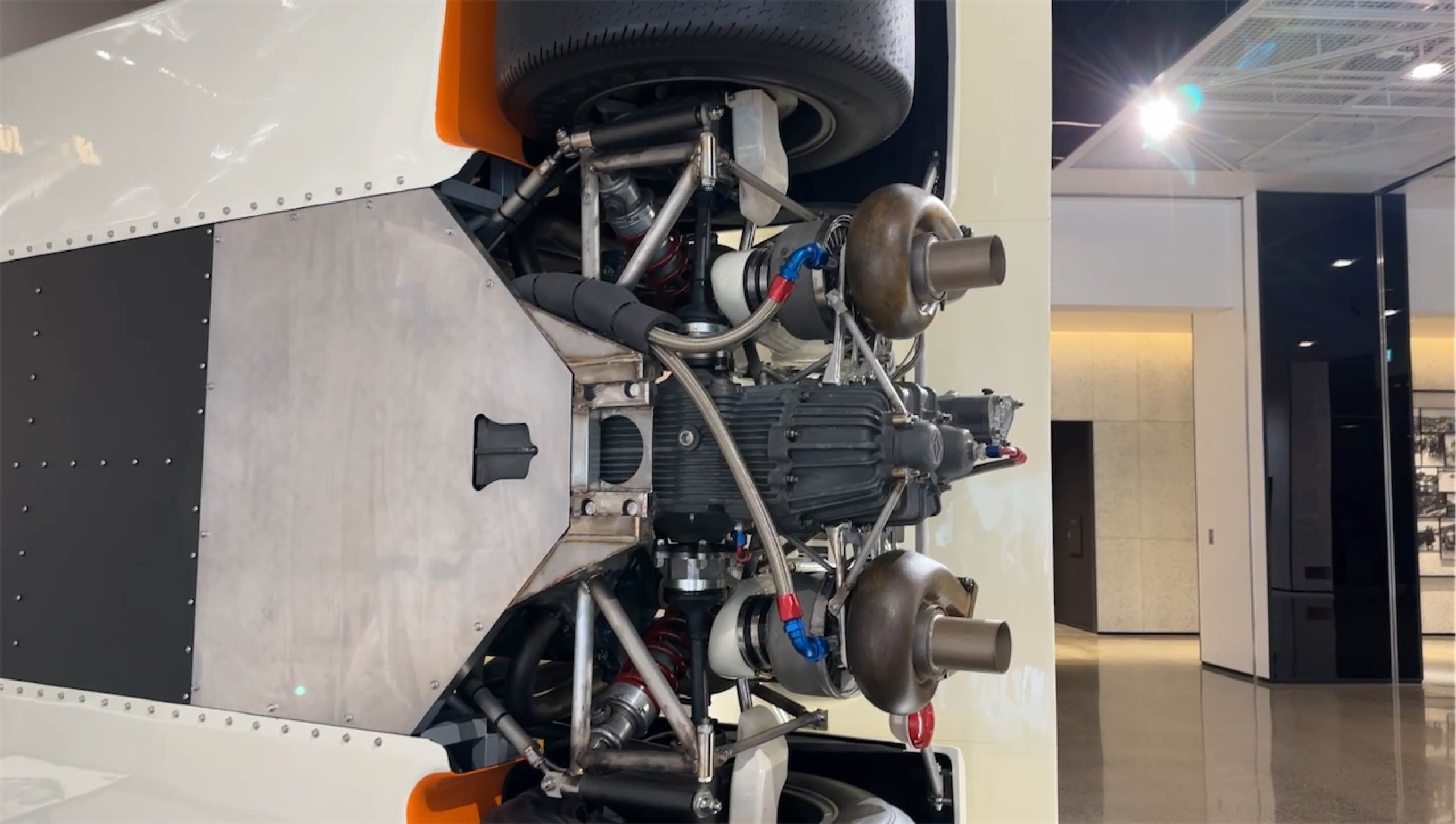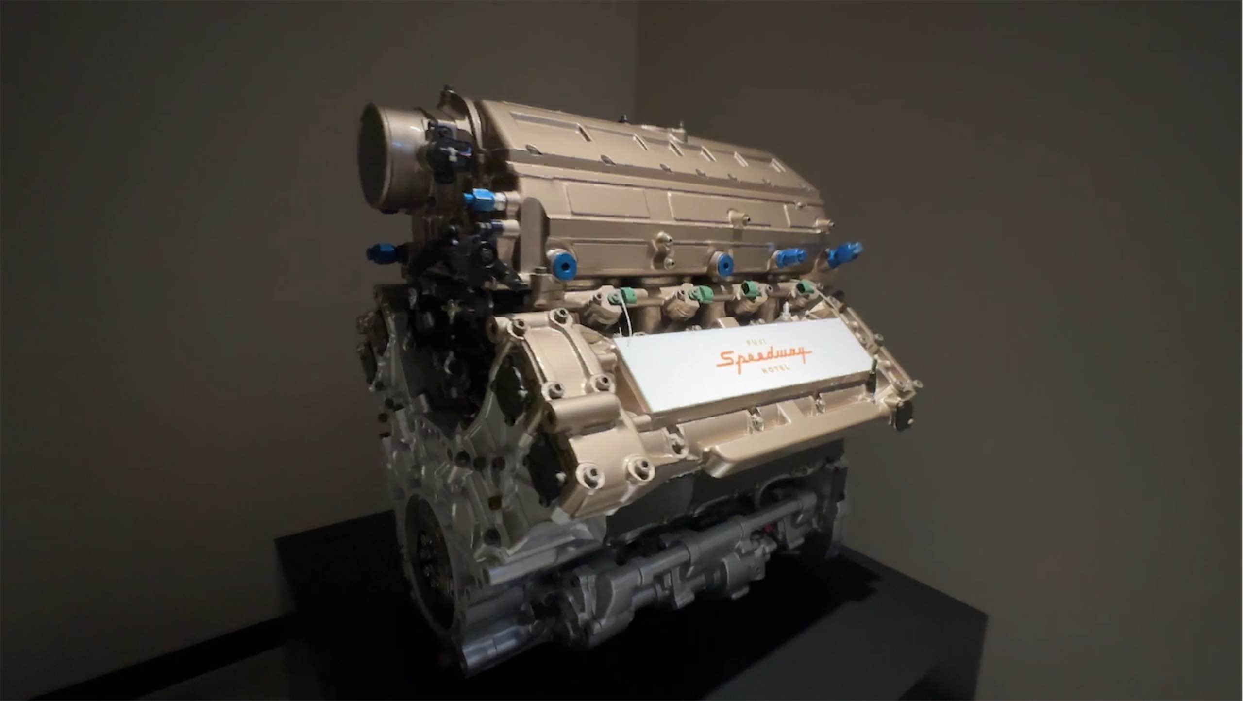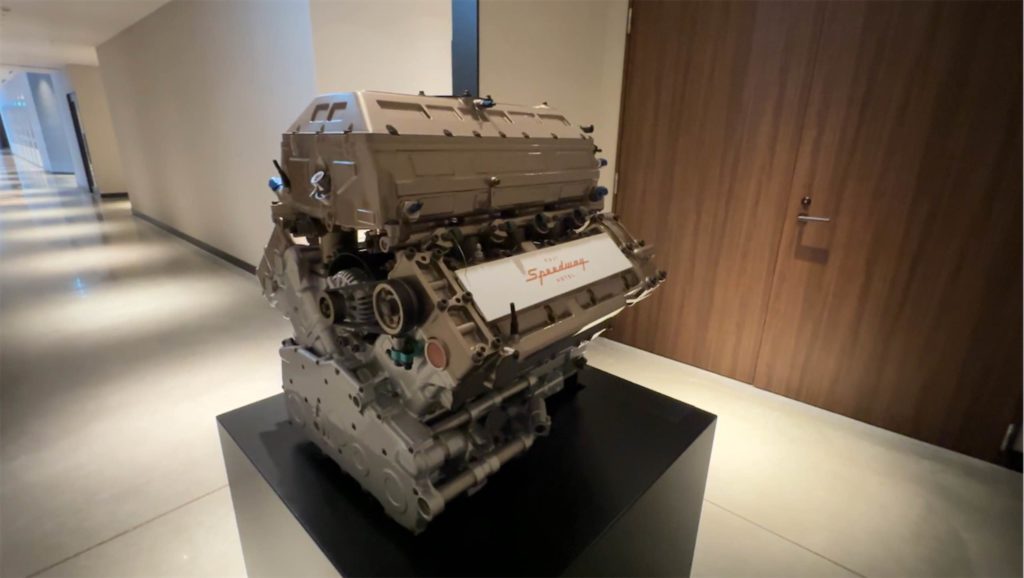 トイレの男女の入り口に分かれるところにはV8エンジンのディスプレイが…なんのエンジンだろうか?