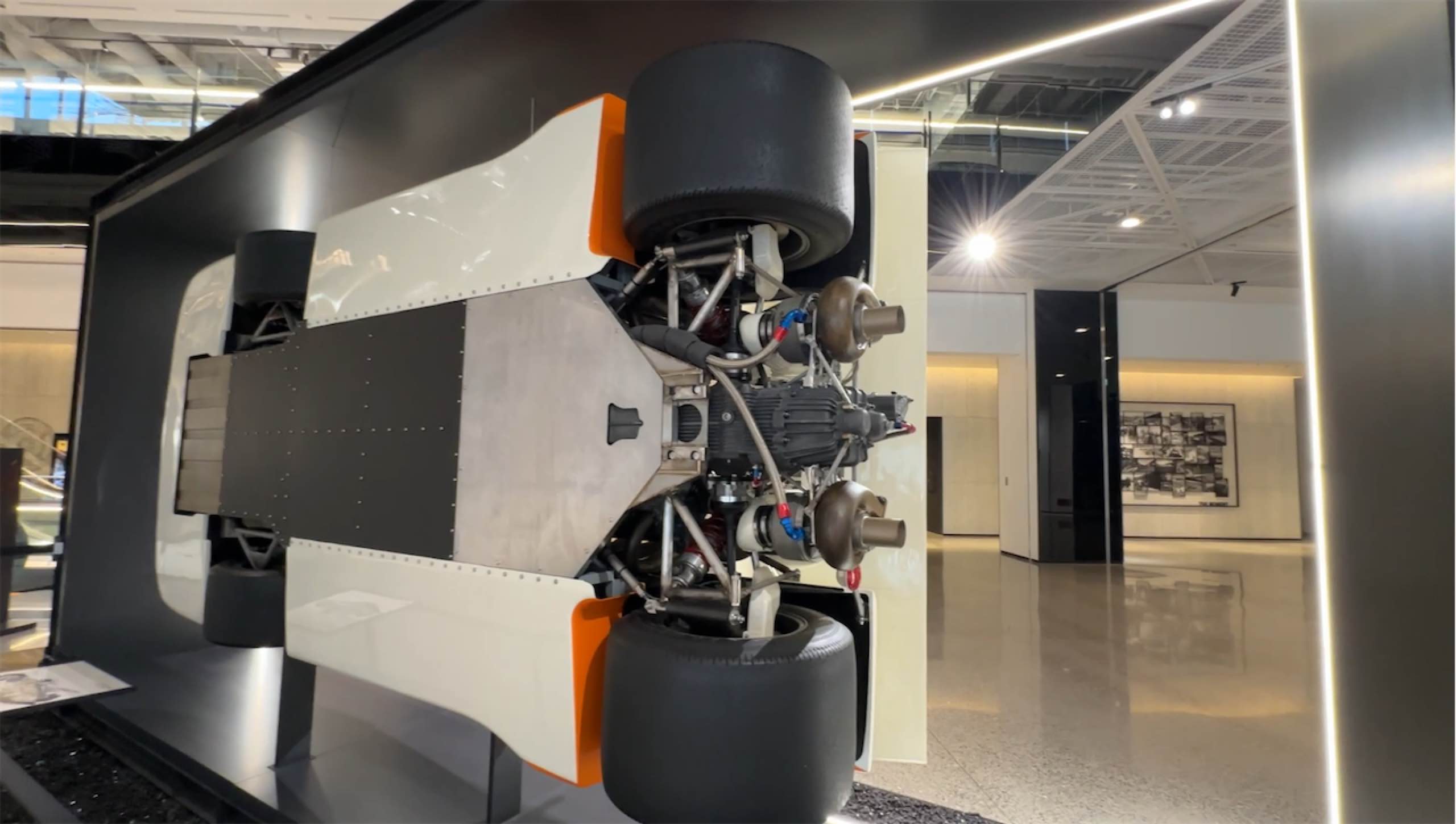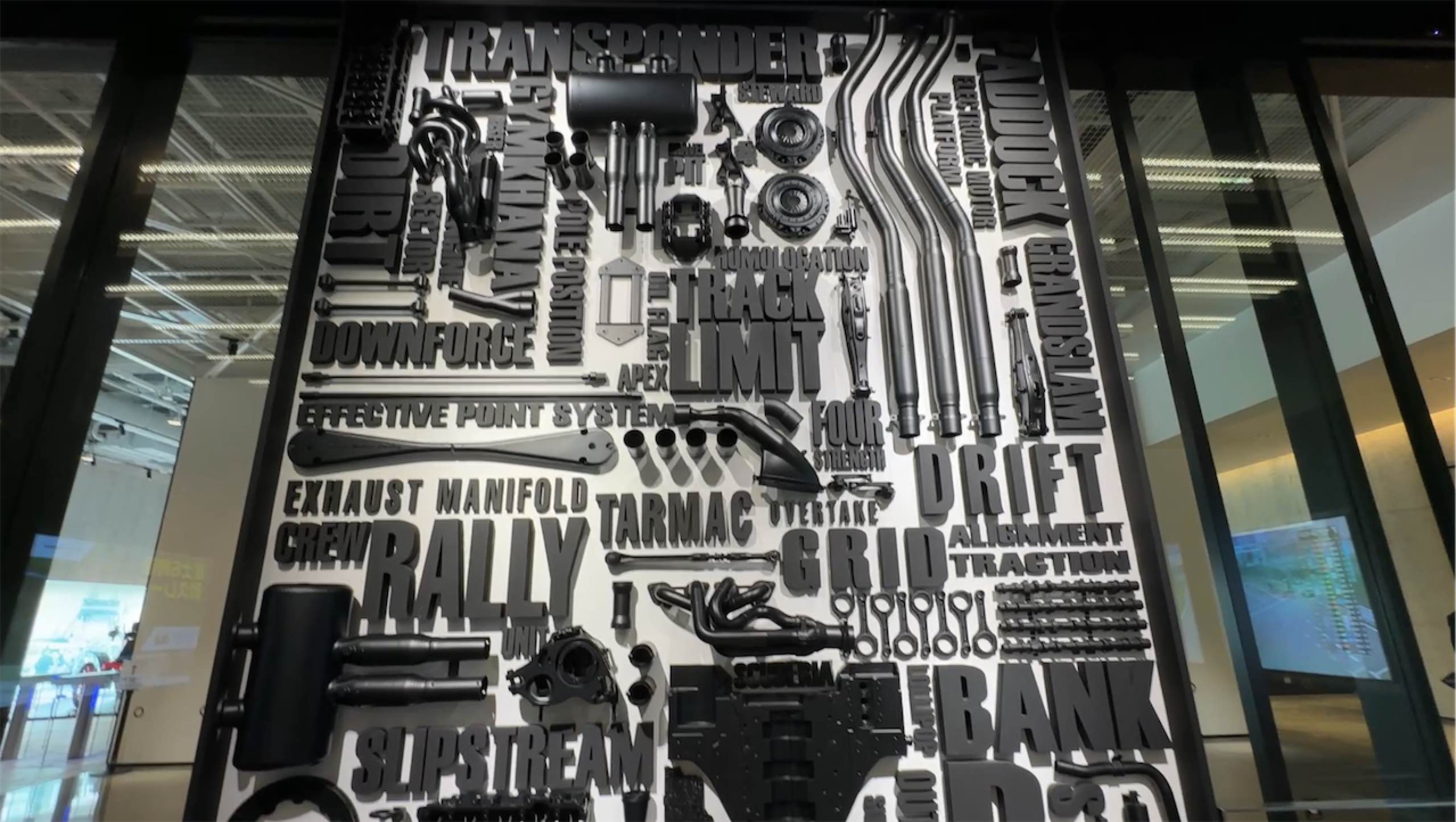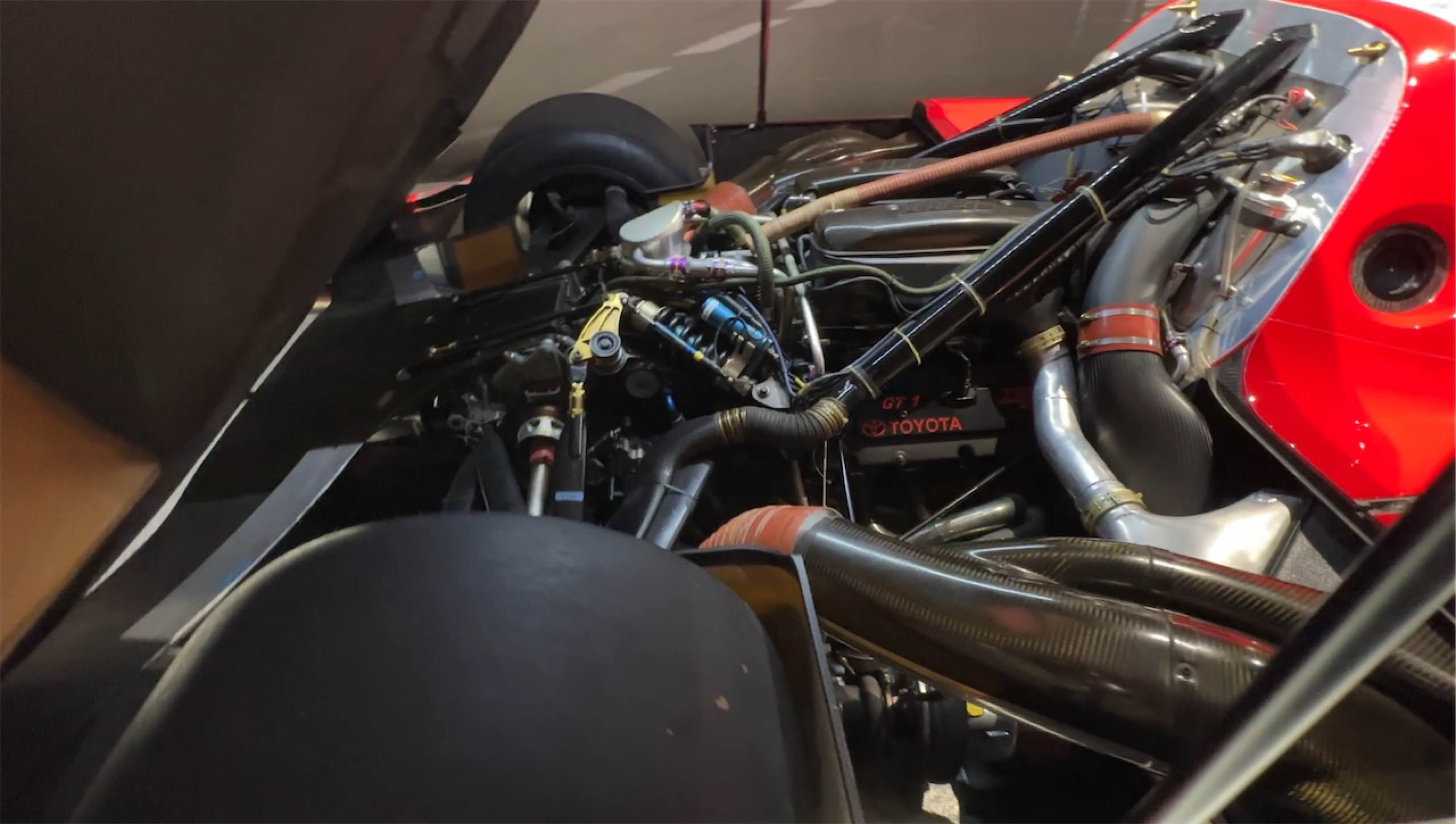 トイレの男女の入り口に分かれるところにはV8エンジンのディスプレイが…なんのエンジンだろうか?