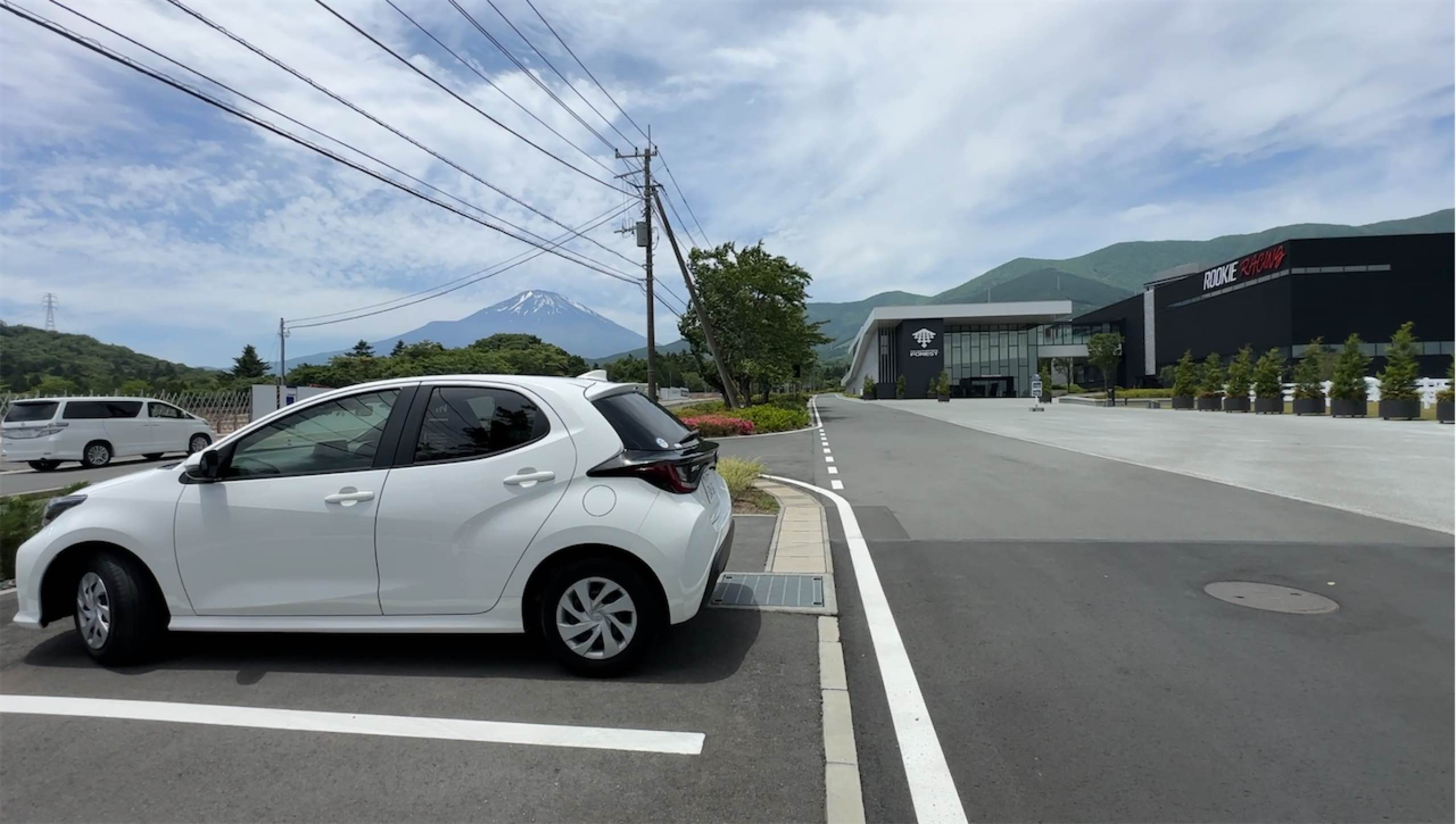一応曇るとアレなので、ルーキーレーシングのファクトリーの前で富士山の写真を撮っておく。
