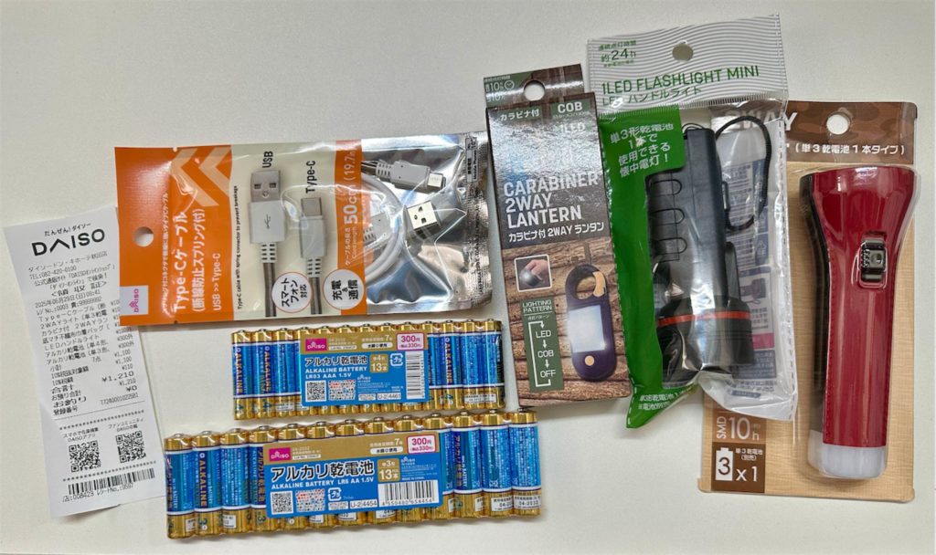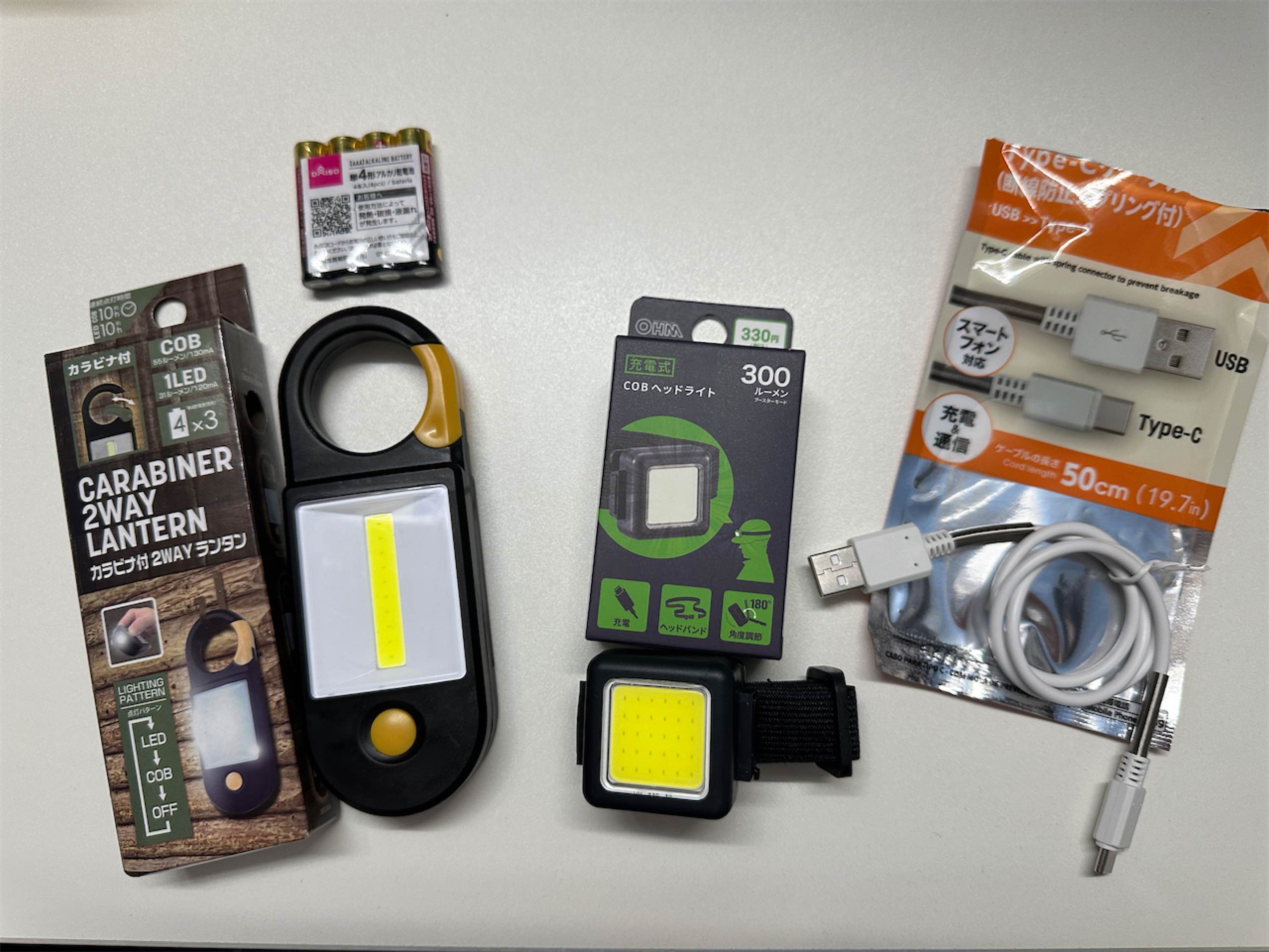 ということで、100円均一で入手できる手頃な照明器具や、懐中電灯と乾電池を色々入手してきました(^ ^)