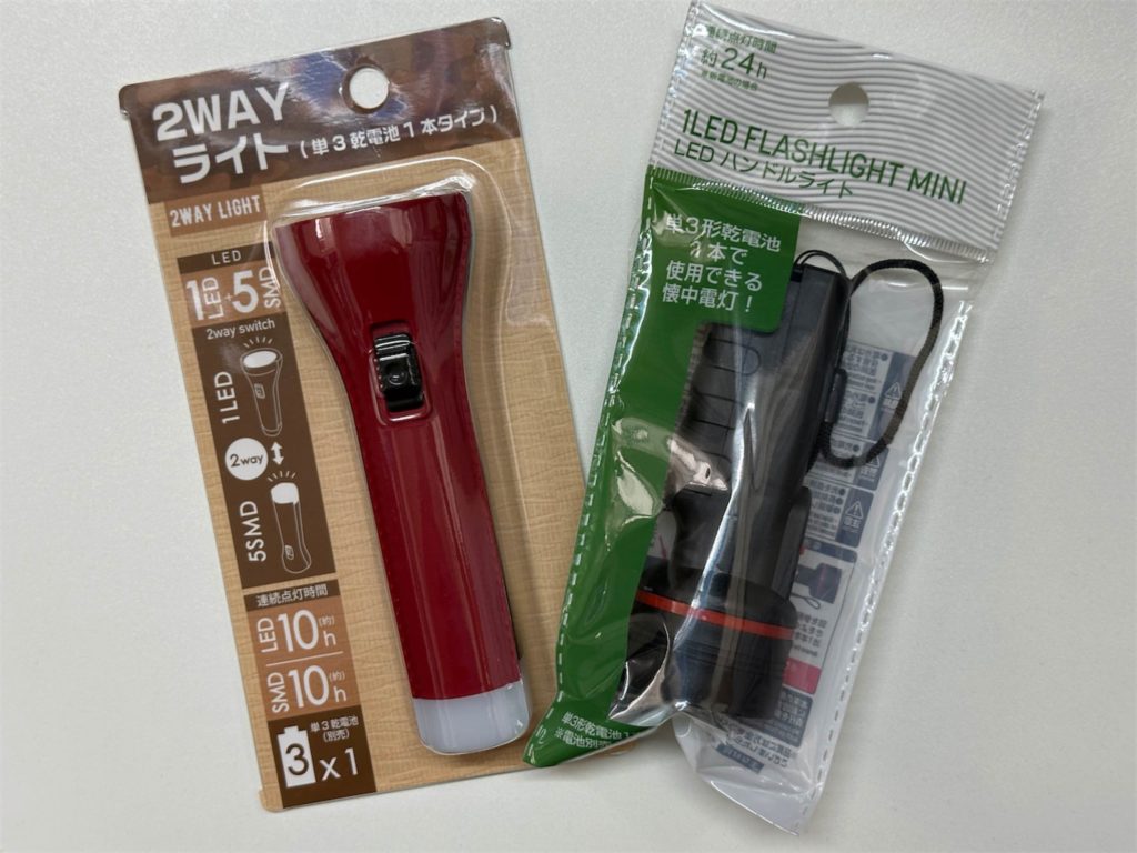 懐中電灯も色々種類はあったのですが、単3電池1本で使えて、連続点灯時間が長めのものを選んで買ってきました。