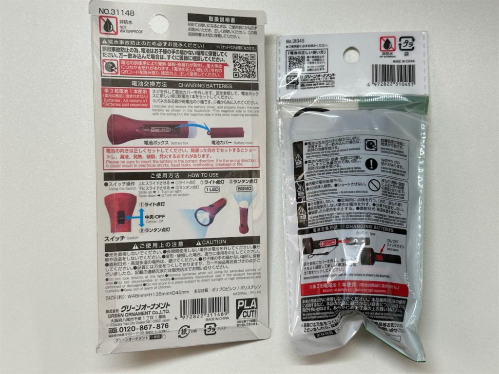 で、どちらも単3電池1本タイプですが、連続点灯時間が左は10時間で右は24時間です。