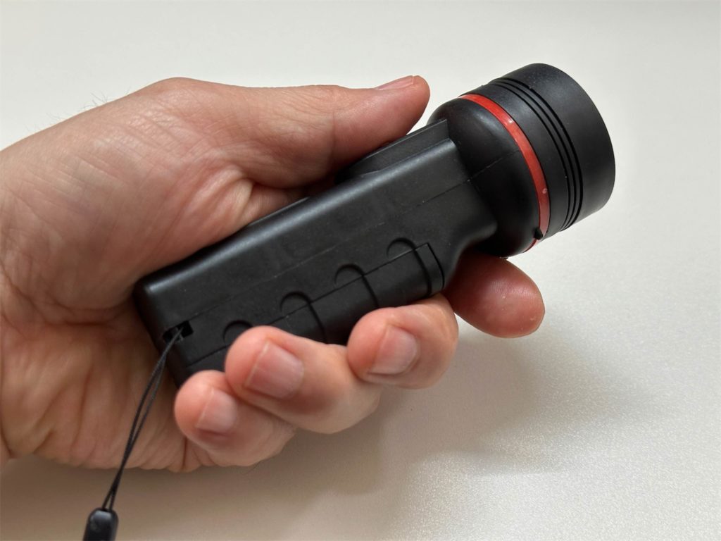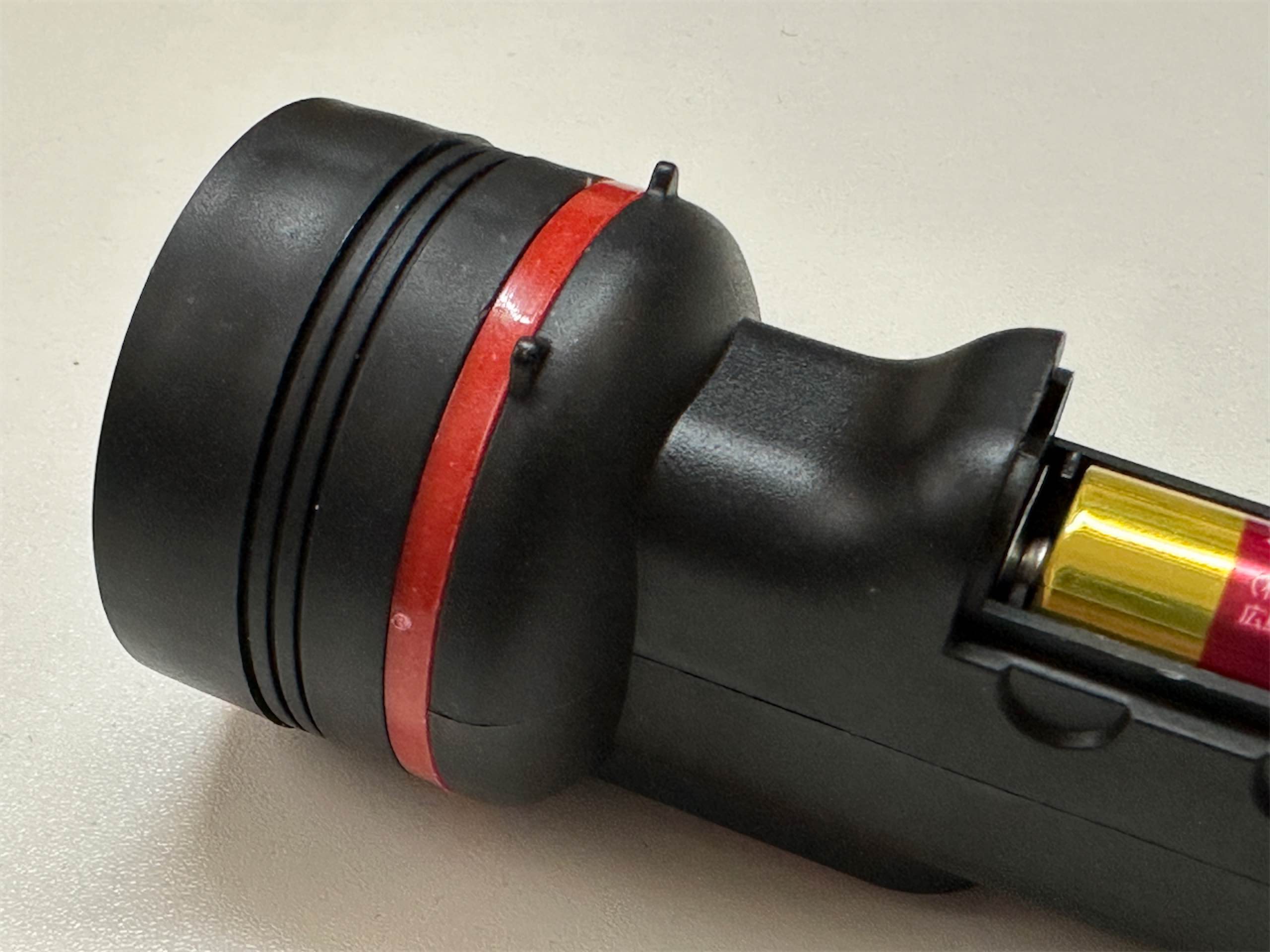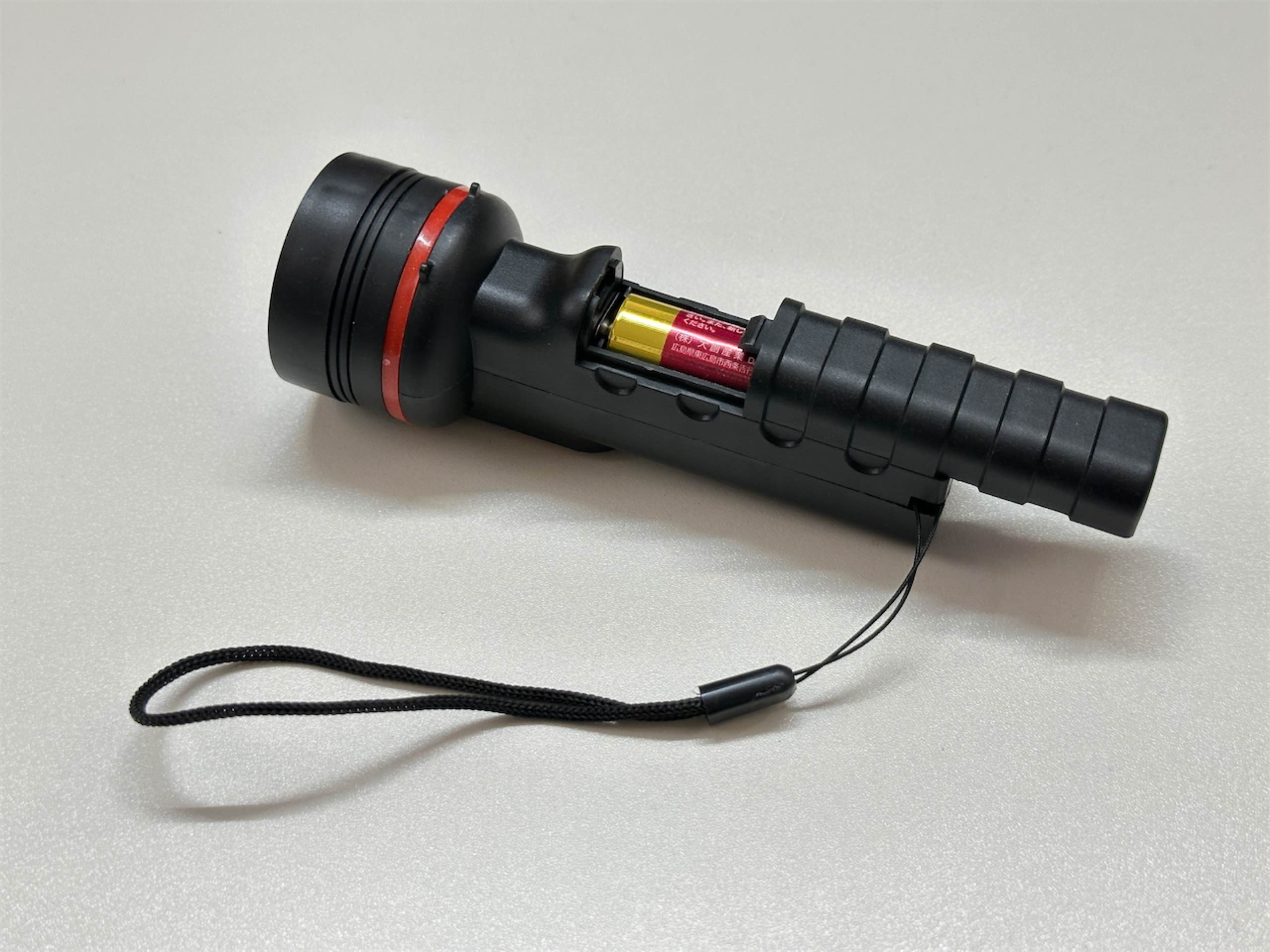 小さい方のライトは、電池カバーはスライド式。ネジ止めではないので、落下時に電池が飛んでいく可能性はあります。ストラップを指に通して(大人の腕に通せるほど長くはありません)落とさないように注意が必要そうです。あらかじめビニールテープかマスキングテープ等を巻いておいても良いかも知れません。